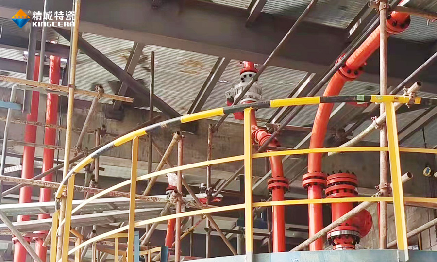 99氧化鋁陶瓷硬度超過HRA85,防磨能力出色,精城又以高溫陶瓷膠粘貼安裝。精城的高溫陶瓷膠可以在350℃的高溫下保持粘性,可以保障該冷氫化輸送管道平穩(wěn)運(yùn)行。為了減少拼接縫隙進(jìn)一步提升管道防磨能力和密封性,精城使用了陶瓷環(huán)與