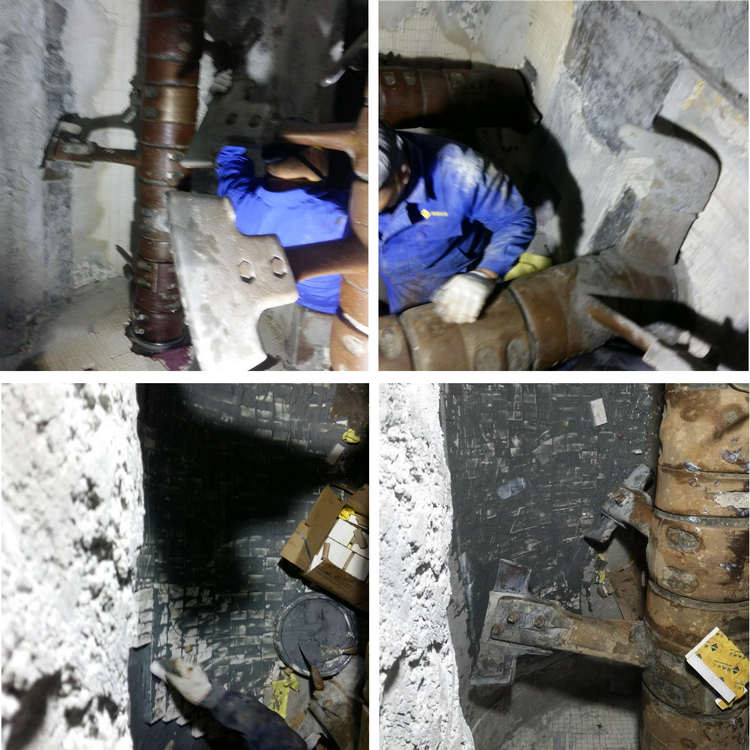 湖北某攪拌站2014年在我公司采購(gòu)一批混凝土攪拌機(jī)耐磨陶瓷襯板,并由我公司現(xiàn)場(chǎng)施工安裝,攪拌機(jī)耐磨陶瓷襯板設(shè)計(jì)使用壽命3年或產(chǎn)量達(dá)60萬(wàn)方,而實(shí)際使用壽命達(dá)到4年產(chǎn)出量約80萬(wàn)方,耐磨性能及產(chǎn)量輸出遠(yuǎn)超實(shí)際設(shè)計(jì)磨損。這次修復(fù)主要針對(duì)磨損嚴(yán)重及其損壞部件,精城公司安裝隊(duì)結(jié)合多年的應(yīng)用經(jīng)驗(yàn)及企業(yè)自身的加工優(yōu)勢(shì),使用精細(xì)工藝與耐磨材料相結(jié)合的修復(fù)方案。即采用高耐磨精細(xì)氧化鋁陶瓷加超強(qiáng)陶瓷金屬粘合劑在攪拌機(jī)內(nèi)重新打磨粘貼,對(duì)磨損嚴(yán)重部位重新加工加固,缺損部位及磨損區(qū)域全部更換陶瓷襯板,力保滿足使用要求。